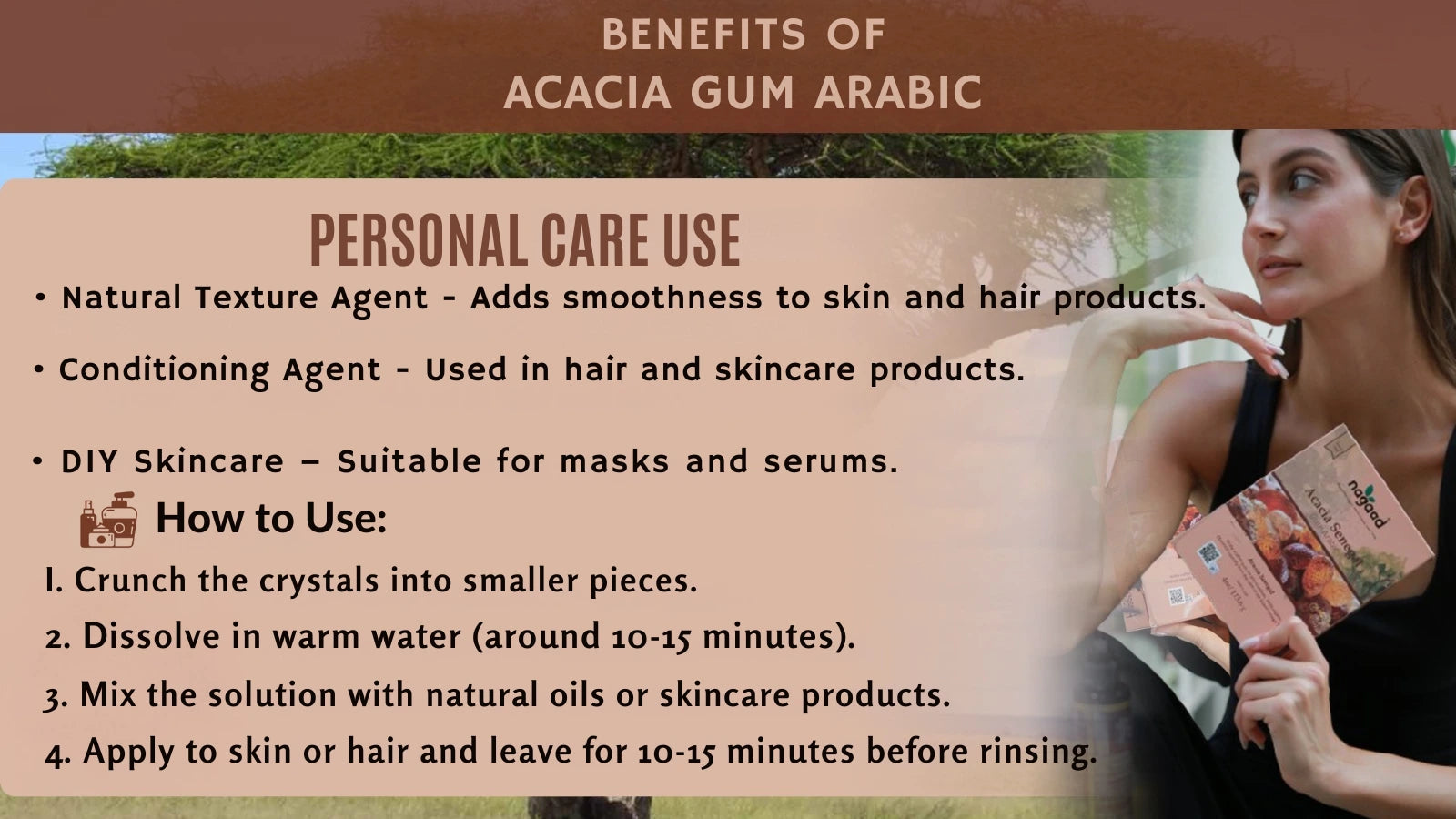 Box of Acacia Senegal Gum Arabic with product details and image of gum.
