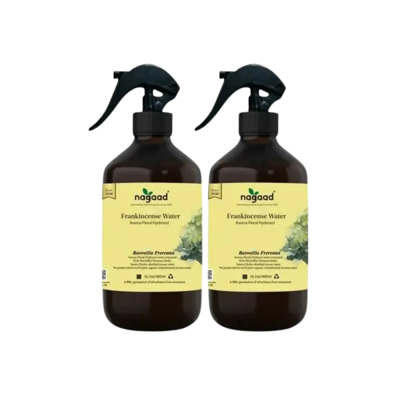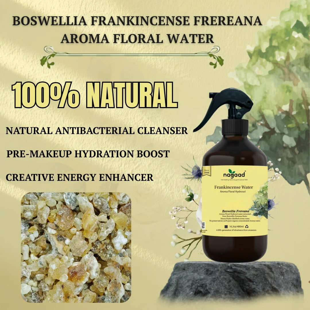 The steam distillation process of the Frankincense Resin from Boswellia Frereana yields a unique, exceptional-quality Floral Water containing valuable essential oils and other soluble constituents. This product is suitable for all ages and various skin types, offering a delightful fragrance.
