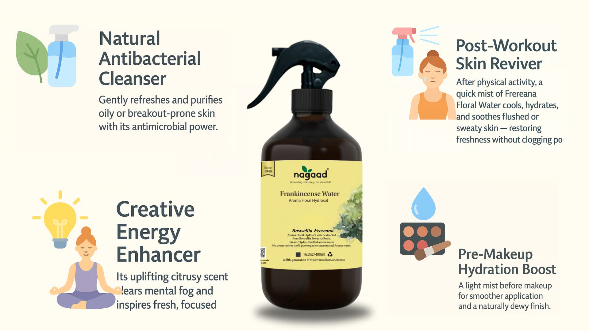 Steam-distilled from Boswellia Frereana resin, this floral water contains no additives or preservatives. It's sustainably harvested and fully traceable to its source.